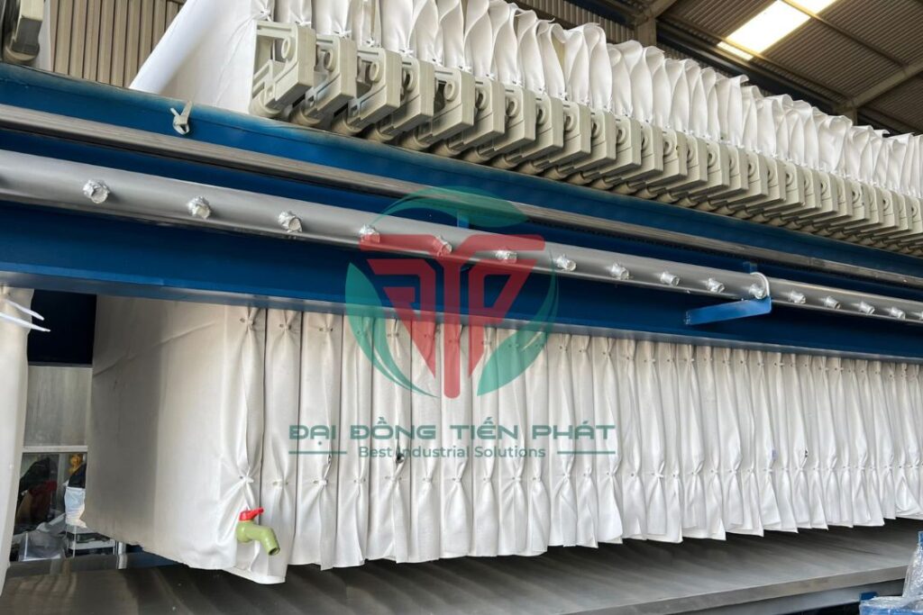Khi hệ thống vận hành, bùn thải dạng lỏng sẽ được bơm vào các buồng ép và đi qua lớp vải lọc. Tại đây, nước sẽ thẩm thấu qua bề mặt vải và được thu hồi về hệ thống xử lý, trong khi phần chất rắn được giữ lại, dần dần hình thành bánh bùn.